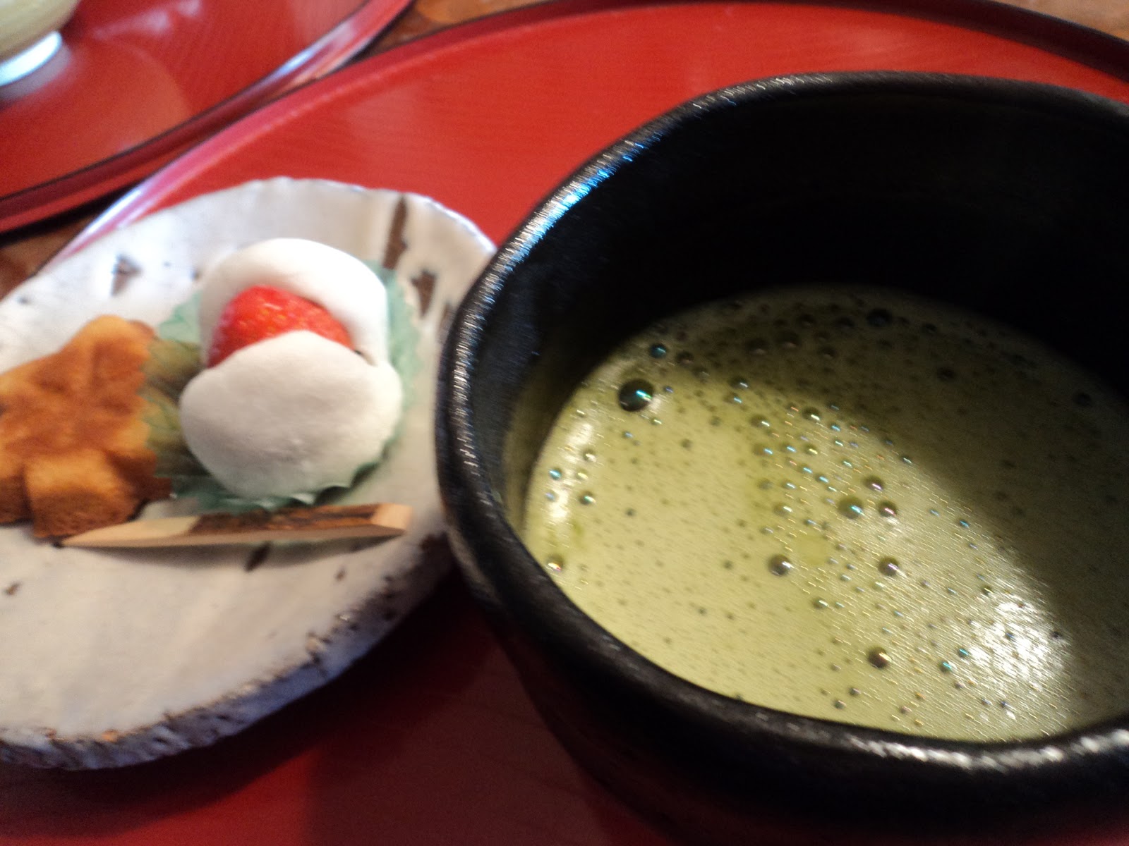 Hitomi is a traditional Japanese woman in that she stays home and works to perfect Japanese cooking and other arts--like calligraphy and the tea ceremony. She served our first thick green tea in a beautiful pottery bowl. She wisked the tea with a little wooden whick/brush. The second tea she served was thinner (regular) green tea. We enjoyed lively conversation, with a little English beween Hitomi and I and Stephanie translating the rest.